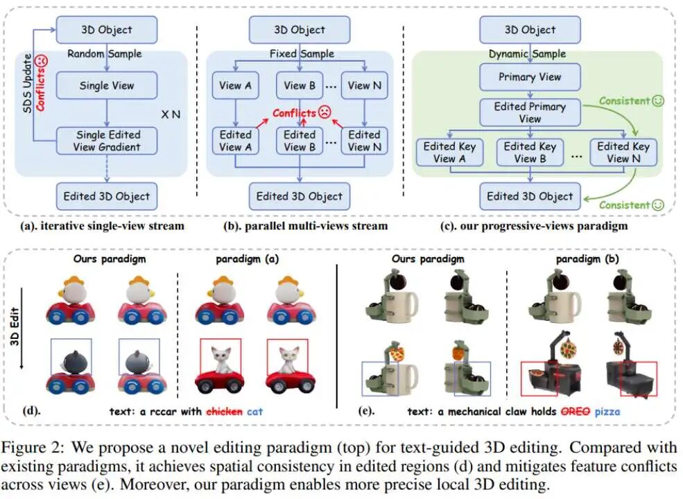 现有的多视图引导下的3D编辑范式忽略了不同编辑指令所引发的差异化跨视图依赖关系,难以在多视图层面做到准确且一致的多视图编辑,这种多视图层面的特征不一致最终导致了编辑出的3D物体质量下降。