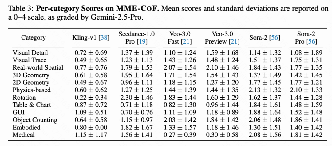 - Sora-2 在物理、具身与医学推理中表现相对突出;