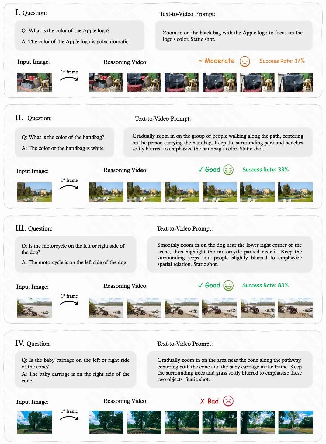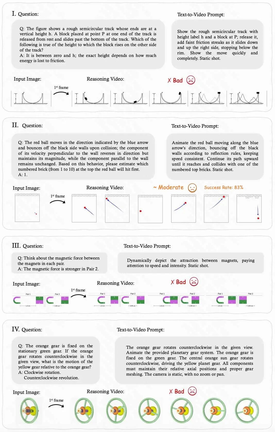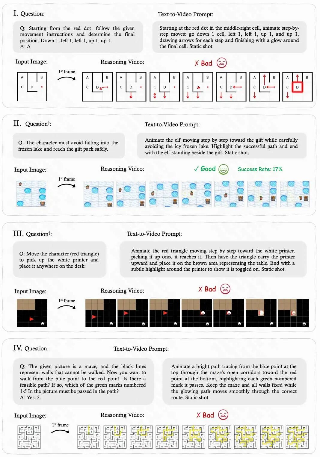 研究团队围绕 12 个推理维度构建了系统测试,对 Veo-3 模型进行了实证评估。以下为部分典型任务摘要。