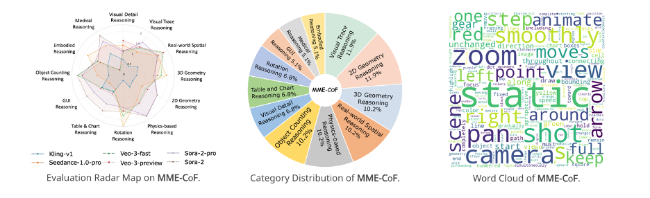 研究团队据此提出 MME-CoF,这是首个专门用于量化视频模型推理能力的标准化评测体系。其主要特征包括: