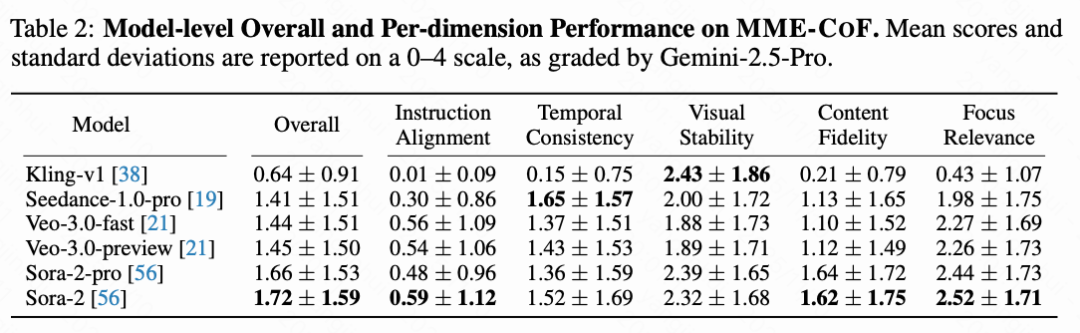 基于 MME-CoF 基准,研究团队对多个主流模型进行了量化评测(由 Gemini-2.5-Pro 评分,满分 4 分)。结果显示: