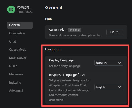 回归正题,下载安装,注册Qoder就不再说了。安装完成默认英文,AI输出的语言也是英文。如果想使用中文需要调整设置。