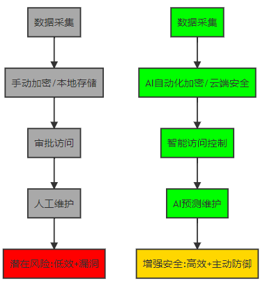 为清晰比较,以下流程图展示传统安全模式与AI适配模式的差异。传统模式以灰调表示其陈旧性,AI模式以亮色象征其活力。