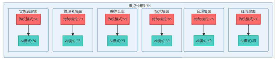 以下图表直观展示了传统企业与AI安全模式在不同层面的风险分布对比,风险值越高表示痛点越严重: