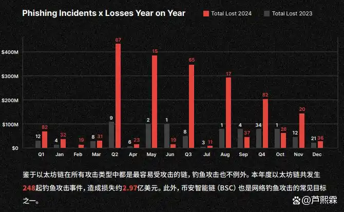 理解Web3安全的核心挑战,必须始于对攻击面的精确测绘。CertiK报告显示,2024年造成损失最严重的两类事件分别是网络钓鱼攻击(Phishing)与私钥泄露(Private Key Compromise)。前者发生296起,造成约10.5亿美元损失,占全年总损失的44.4%;后者发生65起,损失约8.55亿美元,占比36.2%。两者合计贡献了超过80%的年度总损失,而传统意义上的智能合约漏洞利用(如重入、整数溢出等)所占比例相对较小。