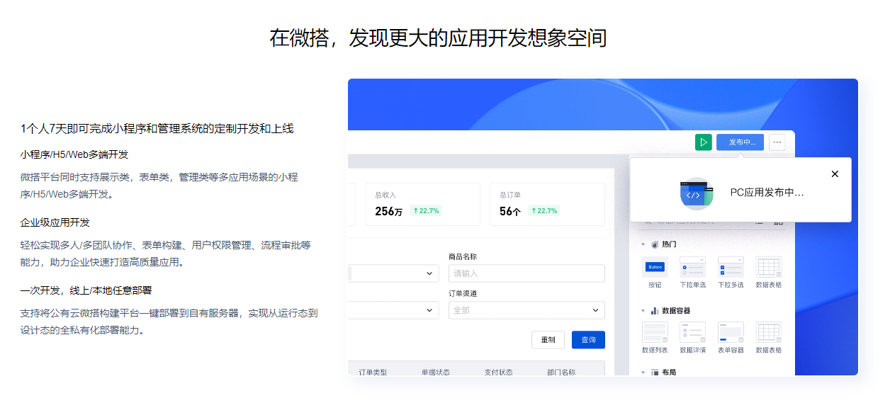 市场评价: 微搭是“微信生态开发者的利器”,特别适合需要快速上线小程序、希望充分利用微信流量红利的企业与个人开发者。其能力范围相对聚焦于前端和轻量级应用,在复杂后端业务系统的构建上并非其设计重点。