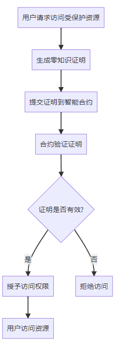 上图展示了零知识证明访问控制的基本流程。当用户想要访问受保护的资源时,首先需要生成一个零知识证明,证明自己满足访问条件。这个证明会被提交到智能合约进行验证,如果验证通过,用户将获得访问权限。