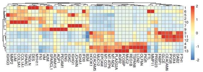 接下来,我们可以进行差异基因表达(DGE)分析,以识别每个聚类的标记基因;我们还计算所选标记基因在各聚类中的平均表达水平: