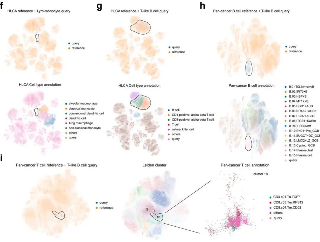 (f) Lym-单核细胞在HLCA单核细胞区域内的UMAP可视化映射; (g) T样B细胞在HLCA中的UMAP可视化分布,显示其定位与CD4 T细胞及CD8 T细胞区域重叠,并突出展示相邻的B细胞群体; (h) T样B细胞在泛癌B细胞图谱中的UMAP可视化映射,显示其与现有B细胞亚群邻近但保持独立; (i) T样B细胞在泛癌T细胞图谱中的UMAP可视化分布。无监督聚类显示T样B细胞主要形成独立群体,图中同时标注周边细胞类型。