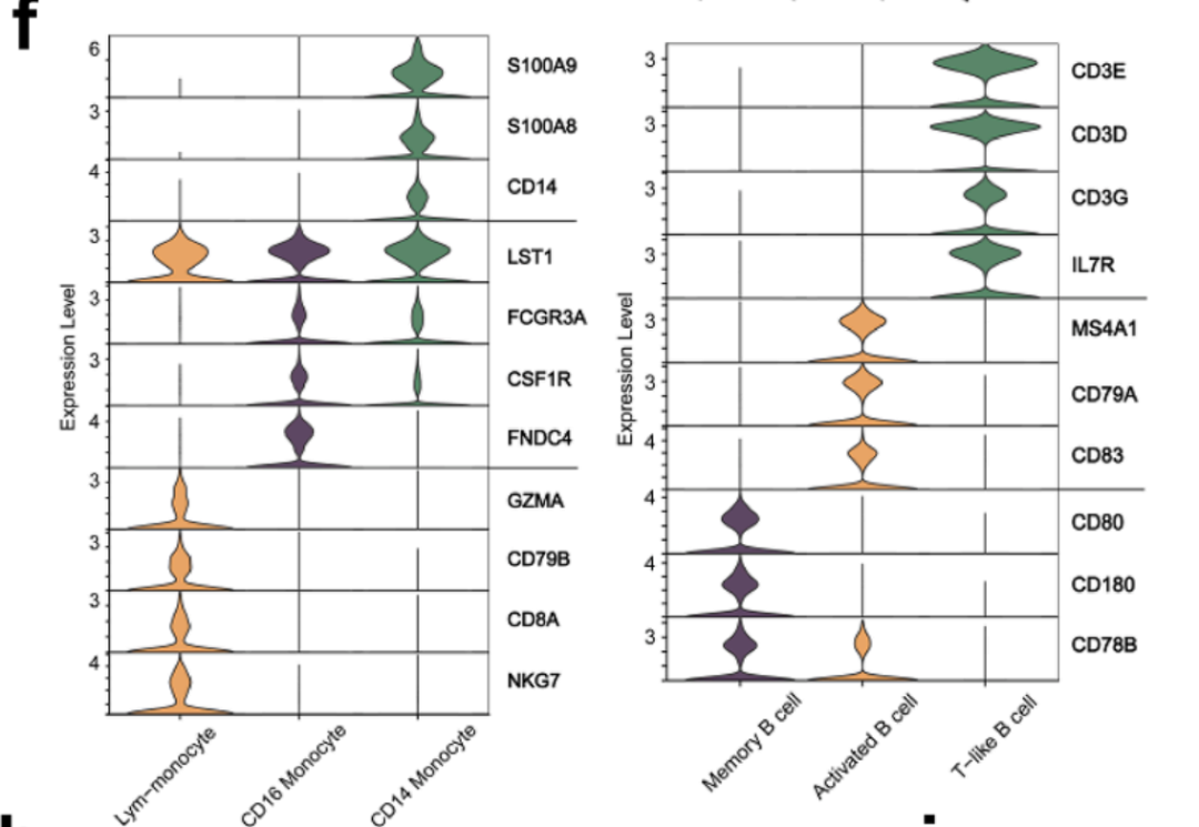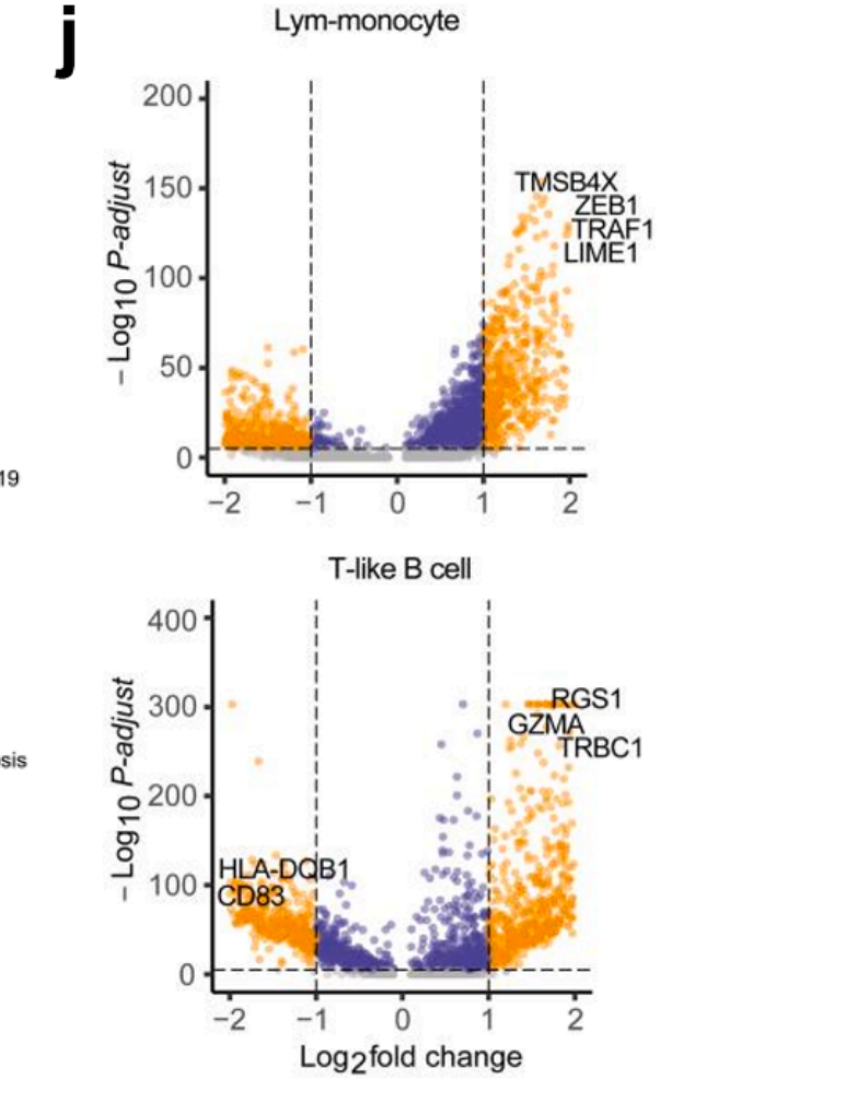 这里面除了分析方法值得细细考量之外,里面还坚定到了两个很像双细胞的亚群:一个表现为淋巴细胞标记物高表达的单核细胞亚群(命名为Lym-单核细胞),另一个则是富含T细胞标记物的B细胞亚群(命名为T样B细胞)。