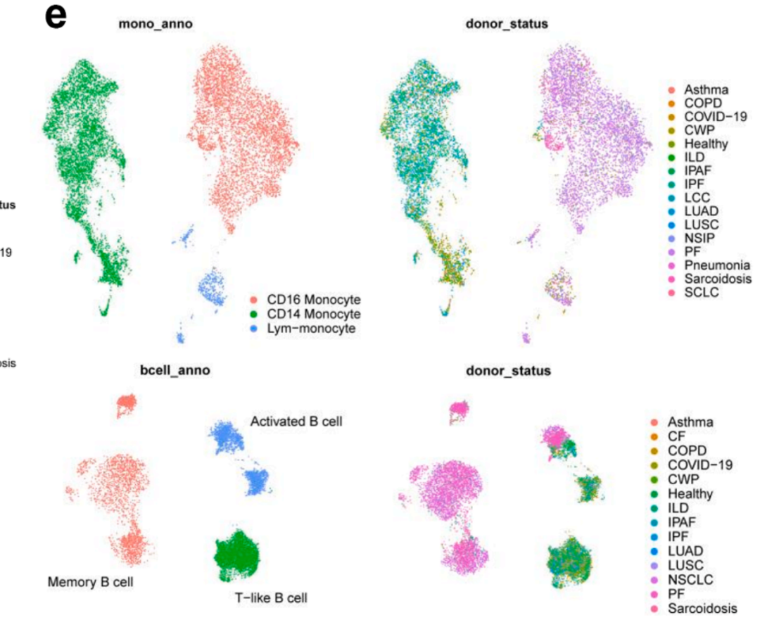 一个表现为淋巴细胞标记物高表达的单核细胞亚群(命名为Lym-单核细胞),另一个则是富含T细胞标记物的B细胞亚群(命名为T样B细胞)。这两个亚群在多种肺部疾病队列中均被稳定检测(图3e和f,作者排除了是双细胞的可能)。