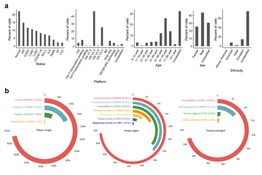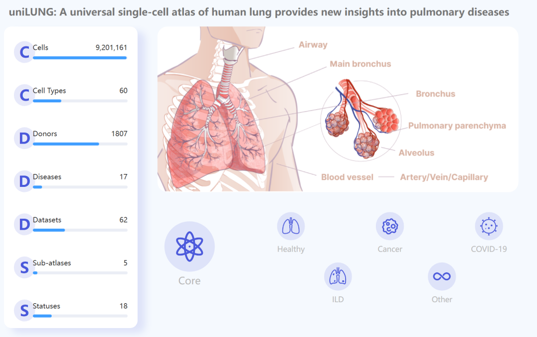 本文通过整合62个已公开数据集(涵盖1807名健康与疾病捐赠者的920万个细胞,涉及17种疾病状态),构建了目前最全面的人类肺部单细胞RNA测序图谱——uniLUNG。网址: