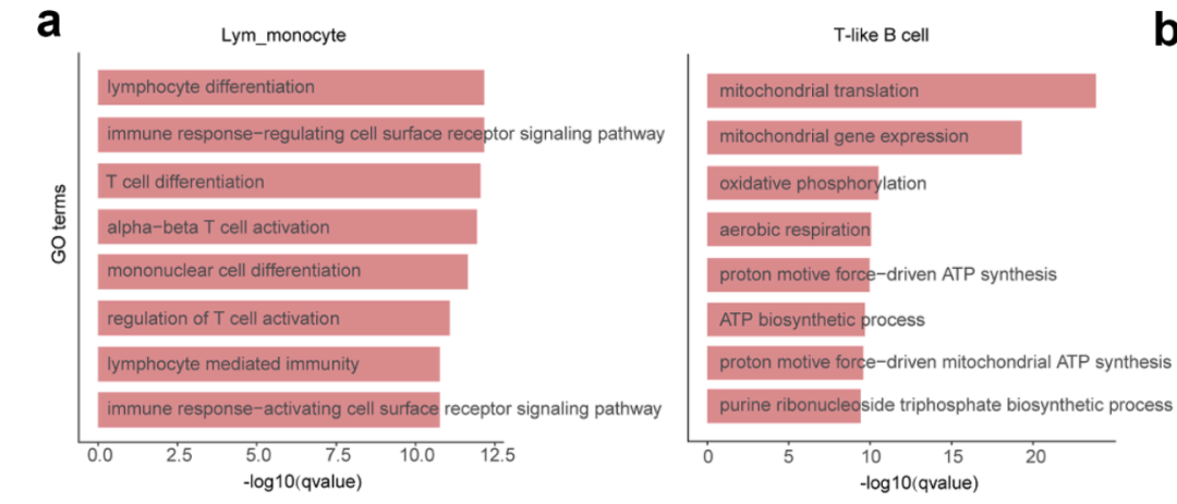 Lym-单核细胞与T样B细胞均上调淋巴细胞标记物(如TMSB4X、ZEB1、TRAF1、LIME1),同时T样B细胞特异性表达T细胞标记物(如RGS1、GZMA、TRBC1)并下调部分B细胞标记物(如CD83、HLA-DQB1)(图3j)。GO富集分析进一步证实,Lym-单核细胞主要富集于淋巴细胞及T细胞相关生物过程,而T样B细胞则与线粒体呼吸及能量代谢通路显著关联(图4a)。