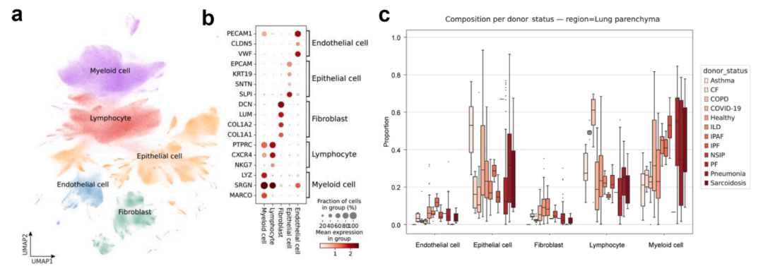 借助uniLUNG资源,作者分析了涵盖18种肺部疾病的组织样本中的1,643,385个细胞,为肺部疾病单细胞研究提供了前所未有的资源平台。经过Harmony进行批次效应校正后,细胞被划分为五大主要类型(图3a和b)。应用 scCODA 评估细胞类型组成的差异(排除恶性细胞),该分析揭示了多个样本层中上皮细胞、淋巴系细胞和髓系细胞在疾病状态下的显著比例变化(图3c,补充图S8)。