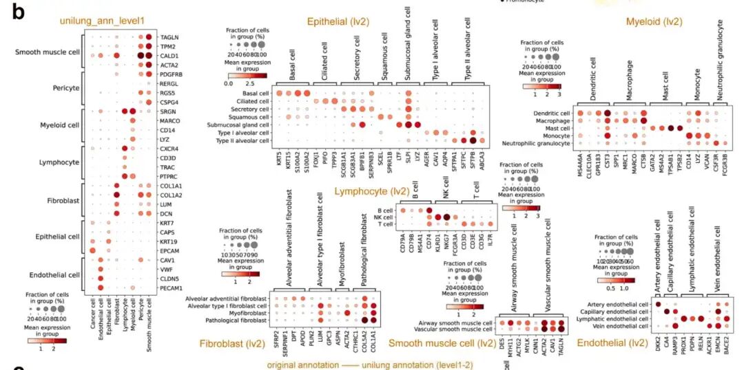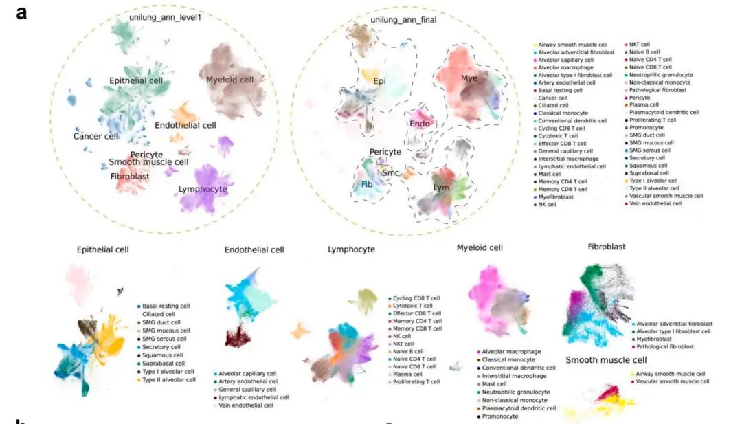 该核心数据集初步被划分为五大主要细胞类型及恶性细胞。通过迭代注释流程,最终在核心图谱中鉴定出60种 distinct 细胞类型(图1c、图2a)。