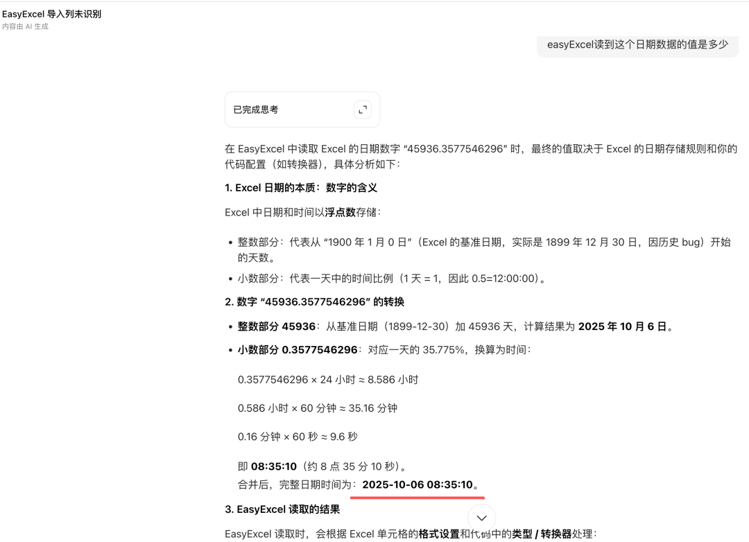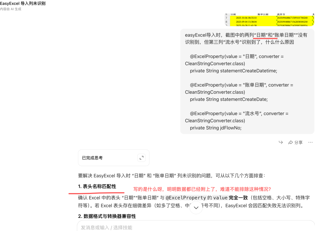 先讲问题的原因:因为这个回归用的excel与实际用的不同。导致Excel 日期列的数据,明明可以看得见,但EasyExcel却读不到。