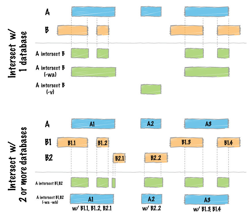 intersect 图解“A intersect B”展示了A和B之间的交集区域。“A intersect B (-wa)”只显示了数据集A中与B交集的部分。“A intersect B (-v)”则展示了数据集A中不与B重叠的部分。"A intersect B1,B2”显示了数据集A与两个数据集B1和B2的交集。通过使用额外的参数(如“-wa -wb”),可以展示两个数据集B1和B2中与A数据集重叠的所有区域。