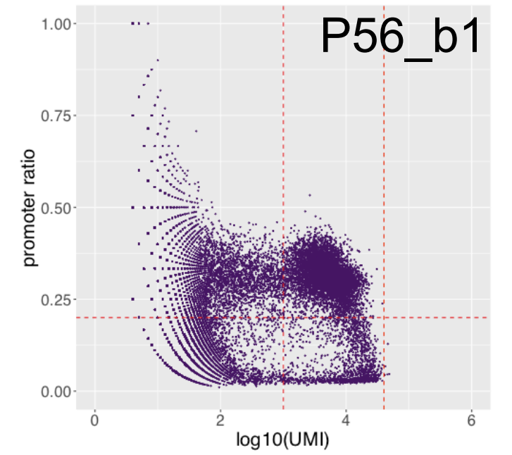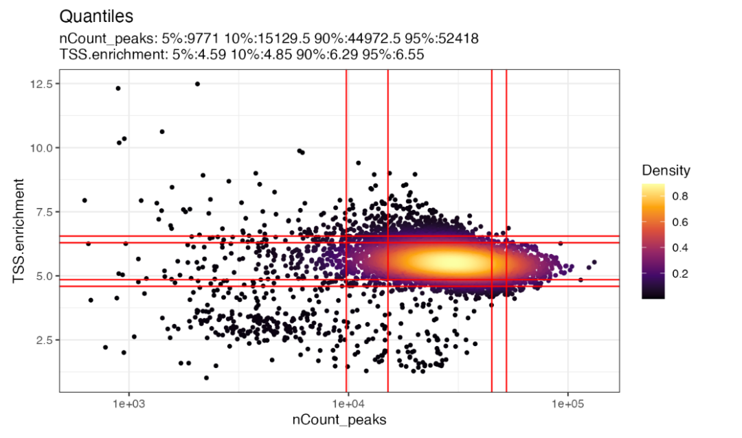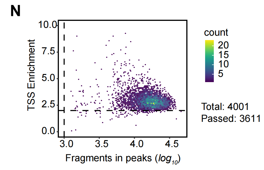 这里每一个点表示一个peak,横轴表示这个peak中的umi reads数,纵轴表示peak的TSS打分。从这个图可以找到一个合适的过滤阈值。