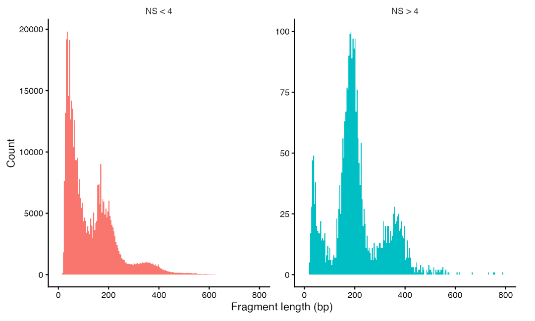 下图正常的核小体信应该在NS > 4的图片中的147~294bp区域有一个峰值,如果没有这个清晰的峰值,那么可以考虑建库或上游的分析存在问题。而NS < 4的图片,应该在< 147bp的区域出现峰值,否则考虑建库或上游的分析存在问题。