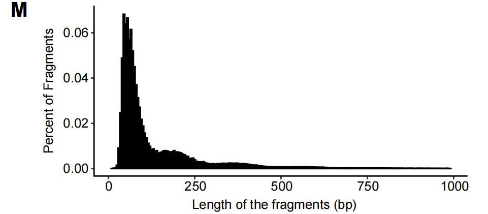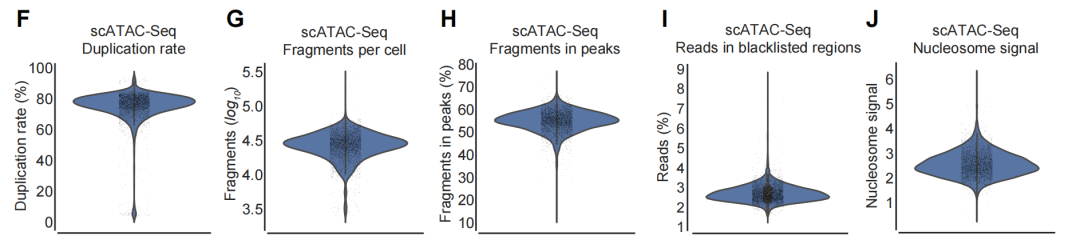 图J:核小体信号,评估每个细胞中由核小体保护的DNA片段的比例。过高的核小体信号可能表明细胞质量差(如发生凋亡,核小体DNA泄露),或实验过程中Tn5酶切效率不佳。
