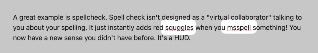 一个熟悉的例子是拼写检查。想想看: 拼写检查并不是以“虚拟协作者”的身份跟你讨论拼写。 它只是在你拼错时立刻标出红色波浪线!于是你瞬间拥有了原本没有的新感官。这就是 HUD。