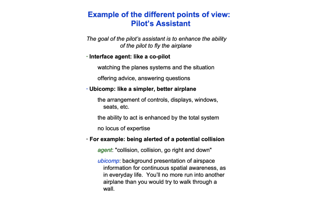 所有人都为此兴奋不已……唯独 Weiser 例外。他反对整套“代理”概念!他举了一个例子:计算机该如何帮你驾驶飞机并避免相撞?