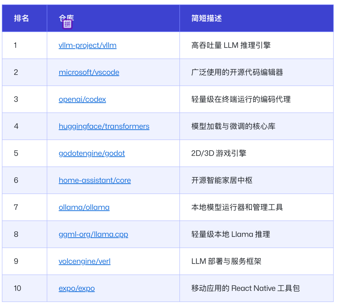 GitHub 发布的 2025 年度开发者趋势报告一文中提到 2025 年最热门的项目分布在 AI 基础设施(vllm、ollama、huggingface/transformers)和持久的生态系统(vscode、godot、home-assistant)之间。