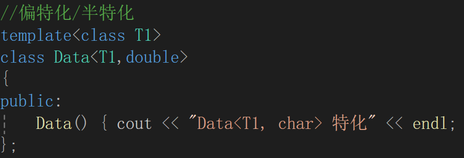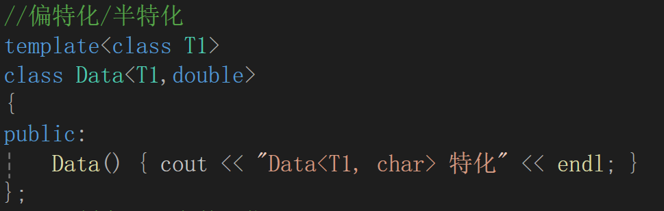 // Data() { cout << "Data<T1, char> 特化" << endl; }
