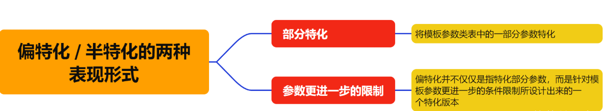 偏特化:也叫半特化,即任何针对模版参数进一步进行条件限制设计的特化版本(部分模版都特化)