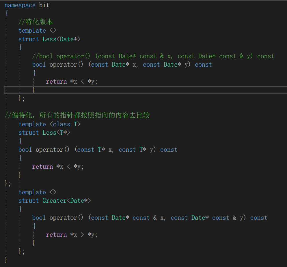 ////bool Less<Date*>(const Date*& left, const Date*& right)//const修饰指针指向内容