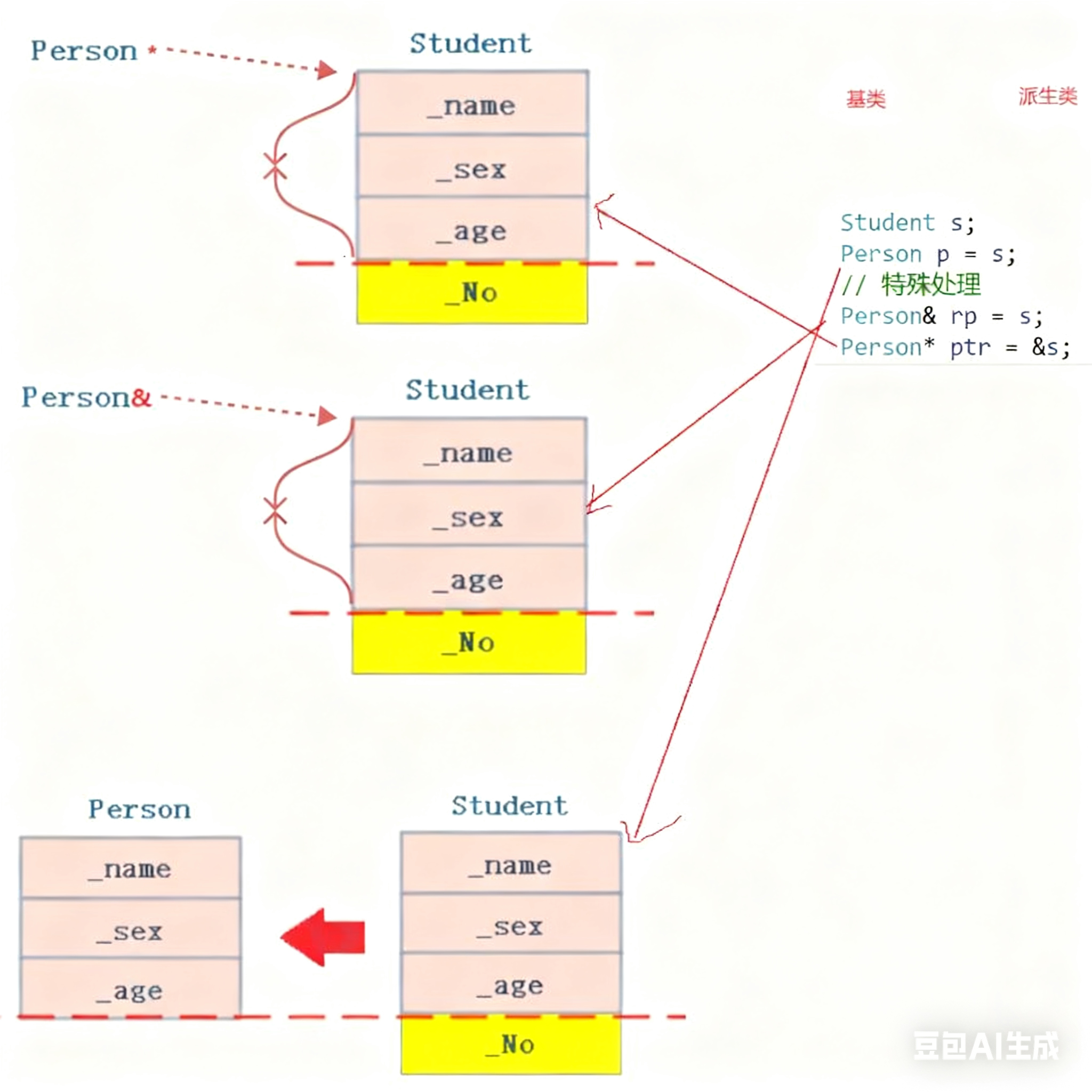 const double&d = i;public继承中,就是一个特殊处理的例外,派生类对象可以赋值给基类的指针/基类的引用,而不需要加const,这里的指针和引用绑定是派生类对象中的基类部分,如下图所示。也就意味着一个基类的指针或者引用,可能指向基类对象,也可能指向派生类对象