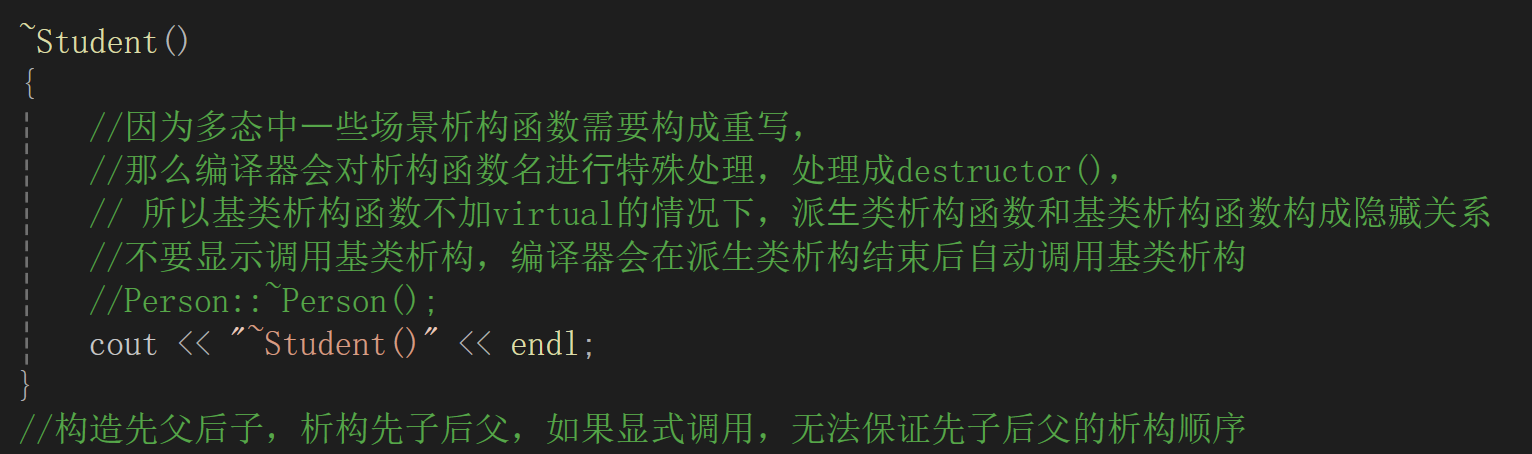 //派生类一般要自己实现构造,不需要显示写析构、拷贝、赋值重载,除非派生类由深拷贝的资源需要处理