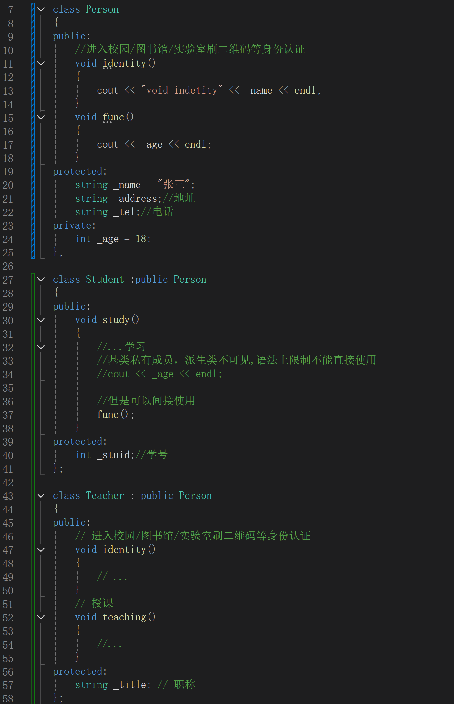 string _name = "Cx330"; // 姓名 我们就可以把公共的成员放到一个类里面,这样就可以复用这个类,可以省去很多代码,使代码变得简洁