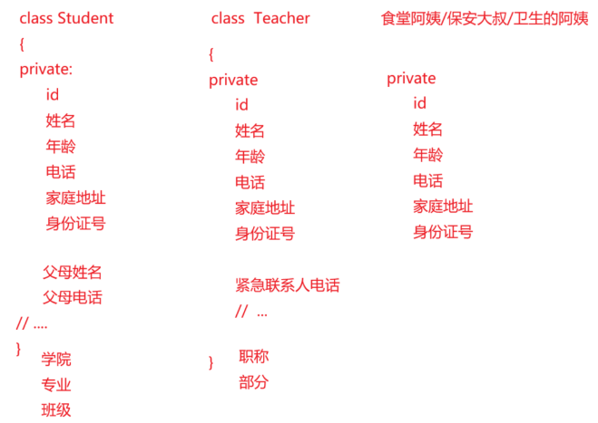 没有继承之前我们设计了两个类Student和Teacher,而这两个类里面都有姓名/地址电话/年龄等成员变量等,设计两个类的话,存在代码冗余,也不简洁,但Student类有自己单独的成员——学号,成员函数——学习,Teacher类有自己单独的成员——职称,成员函数——授课