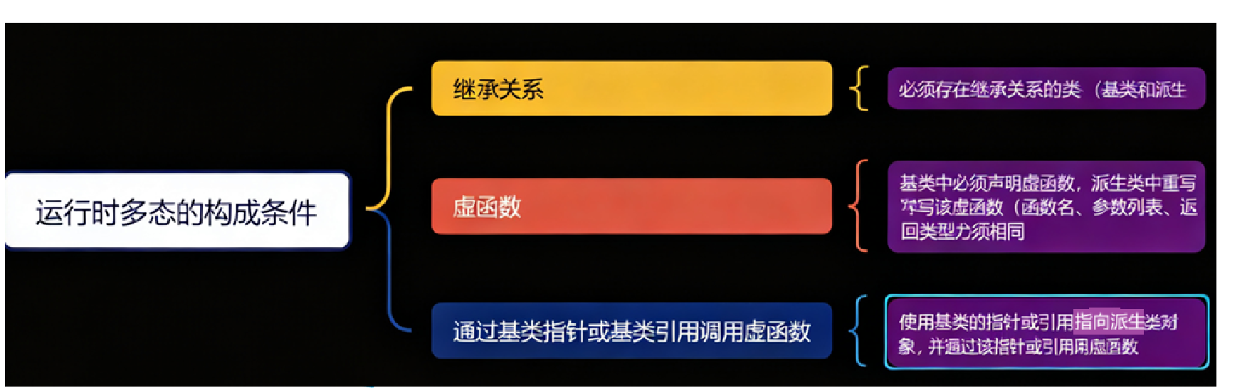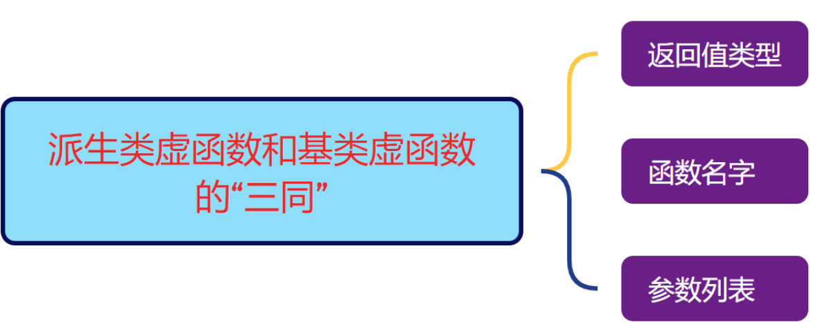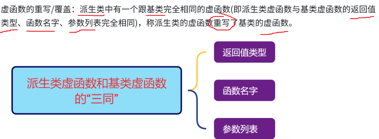 其中,虚函数重写这里注意一下:派生类中有一个跟基类完全相同的虚函数,两者有“三同”