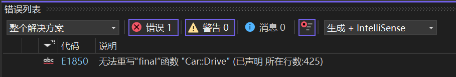 派生类中有一个跟基类完全相同的虚函数(即派生类虚函数与基类虚函数的返回值类型、函数名字、参数列表完全相同),称派生类的虚函数重写了基类的虚函数