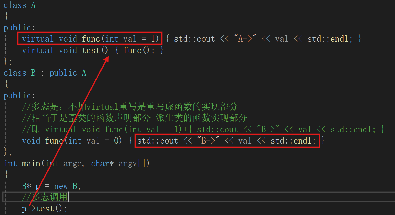 //即 virtual void func(int val = 1)+{ std::cout << "B->" << val << std::endl; }