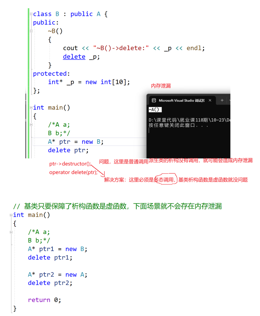 观察下面的代码,我们可以看到——如果~A( )不加virtual,那么delete p2时只调用的A的析构函数,没有调用B的析构函数,就会导致内存泄漏问题,因为~B( )中在释放资源(注意:这个问题面试中经常考察,大家一定要结合类似下面的样例才能讲清楚,为什么基类中的析构函数建议设计为虚函数)