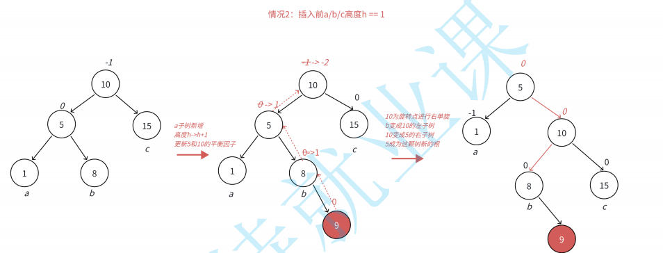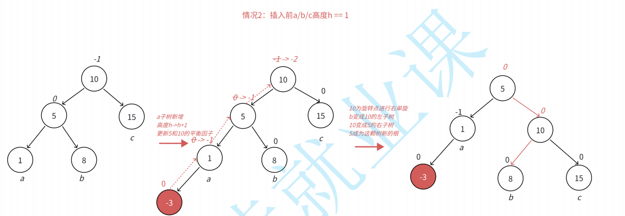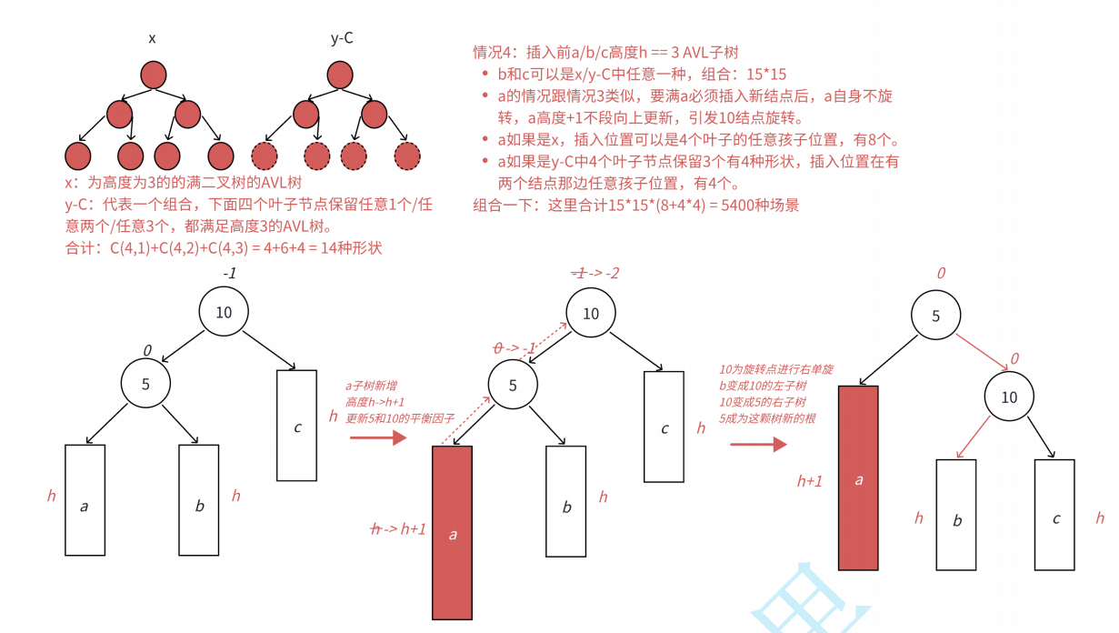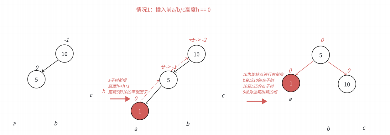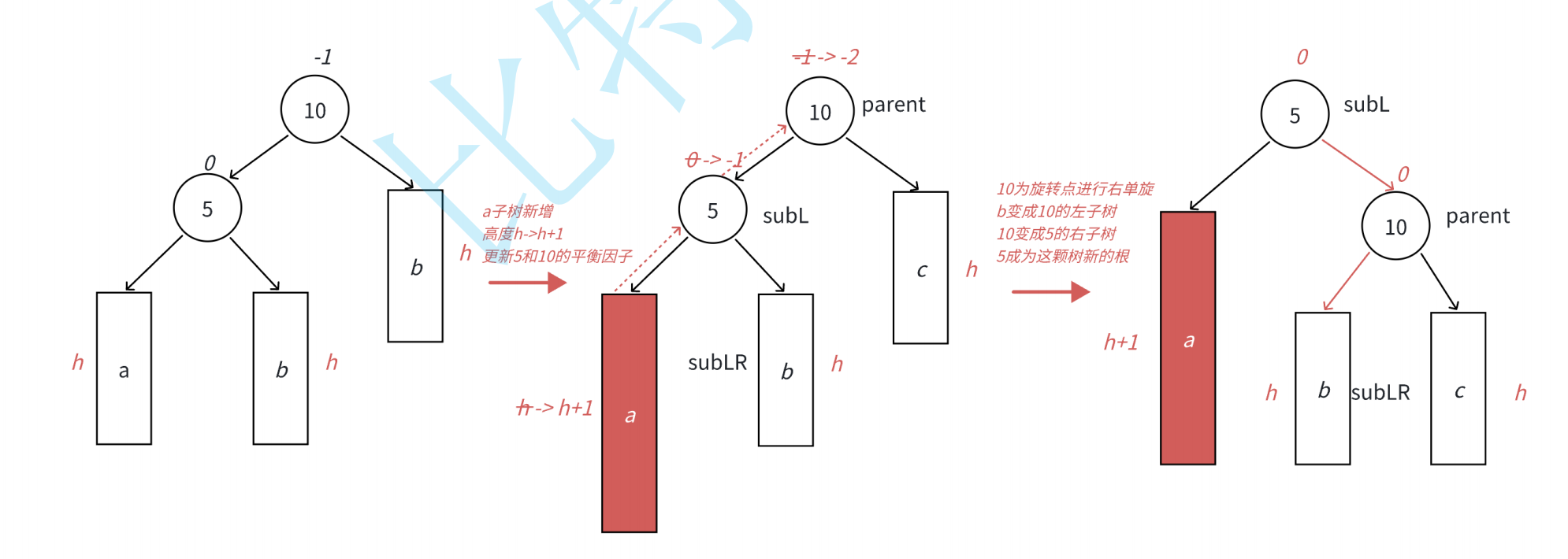 观察发现:当左边高时,若插入位置不是在 a 子树,而是插入在 b 子树,导致 b 子树高度从 h 变成 h+1,引发旋转,此时右单旋无法解决问题,旋转后树依旧不平衡。右单旋仅能解决纯粹的左边高的情况,而当插入在 b 子树时,以 10 为根的子树不再是单纯的左边高:对 10 而言左边高,但对 5 而言右边高,需通过两次旋转解决