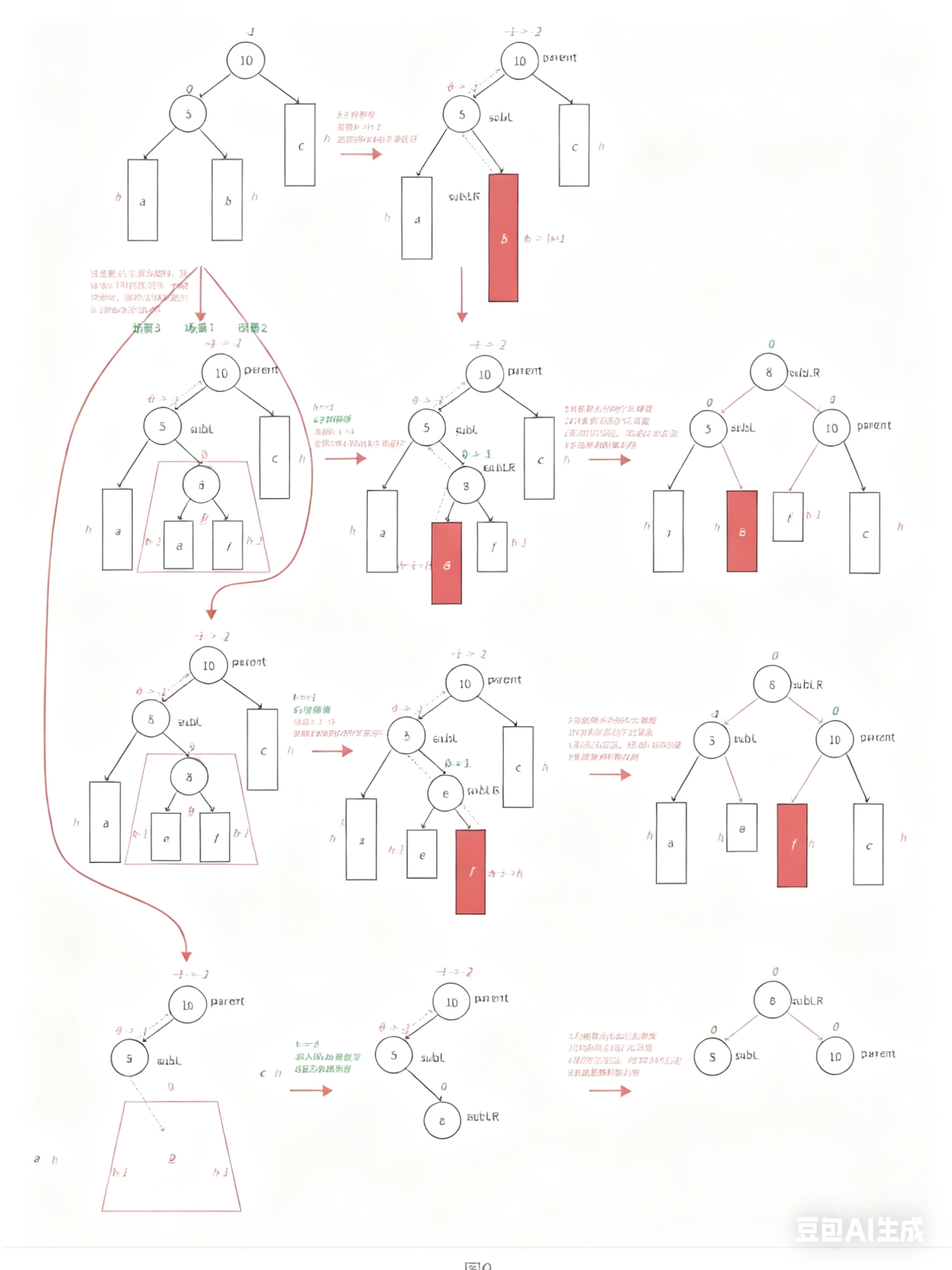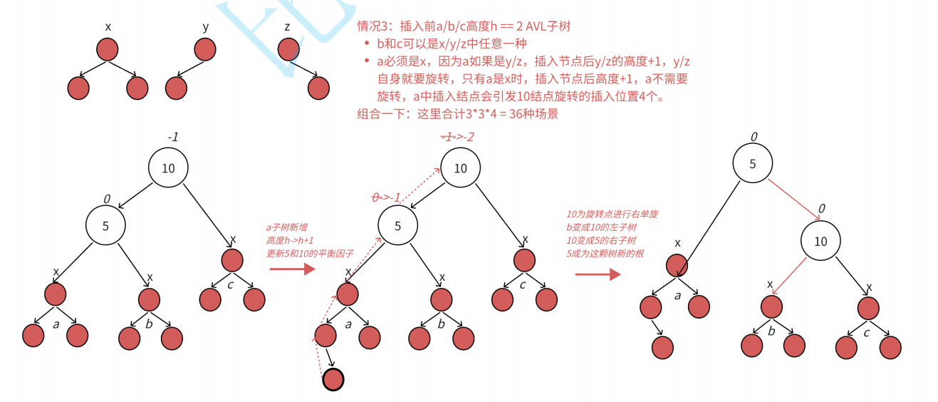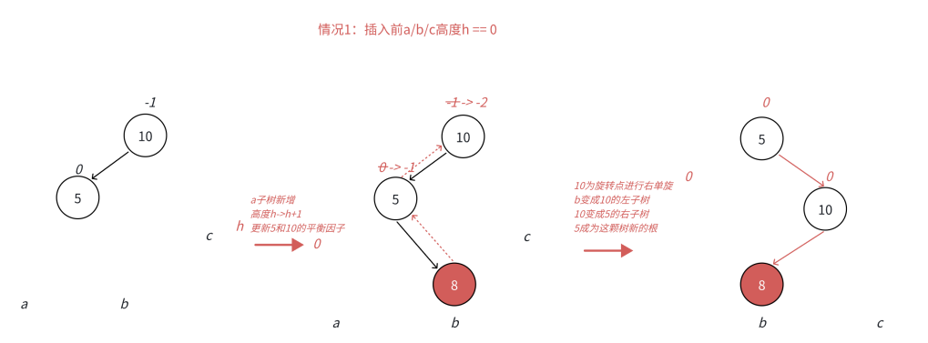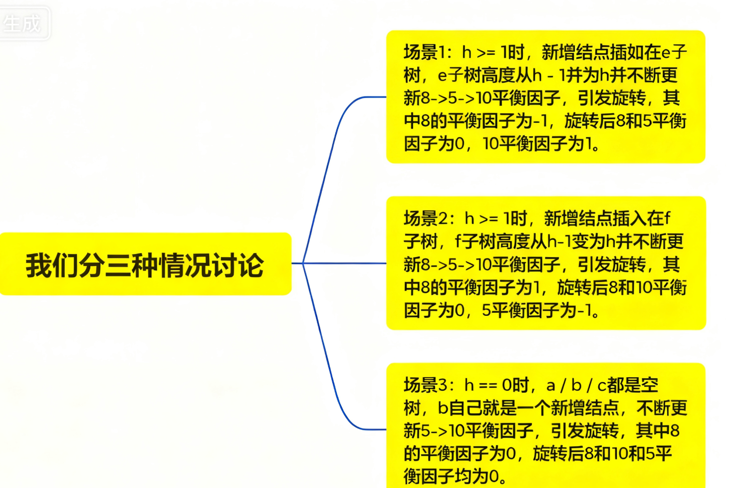上面两种情况图分别是左右双旋中h==0和h==1具体场景分析,下⾯我们将a/b/c子树抽象为高度h的AVL子树进行分析,另外我们需要把b子树的细节进一步展开为8和左子树高度为h-1的e和子树,因为我们要对b的父亲5为旋转点进行左单旋,左单旋需要动b树中的左子树。b⼦树中新增结点的位置不同,平衡因子更新的细节也不同,通过观察8的平衡因子不同,这⾥我们要分三个场景讨论