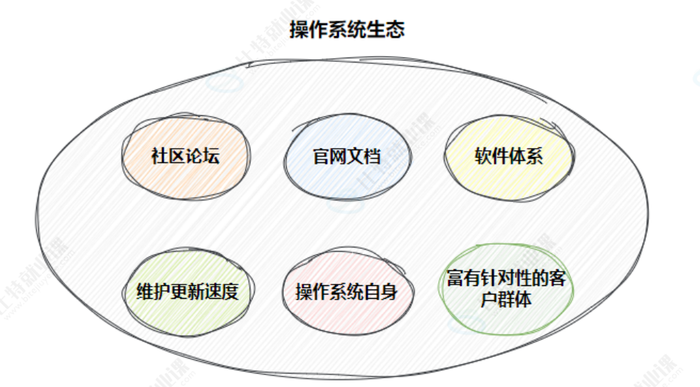 操作系统生态包含了这六个方面:社区论坛、官方文档、软件体系、维护更新速度、操作系统自身、复有针对性的客户群体