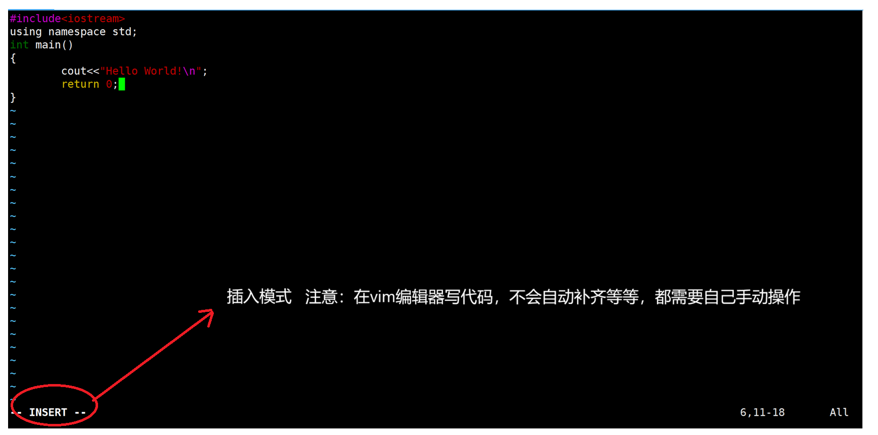 aio:w (保存当前文件):wq (存盘并退出 vim):q! (不存盘强制退出 vim)插入模式: