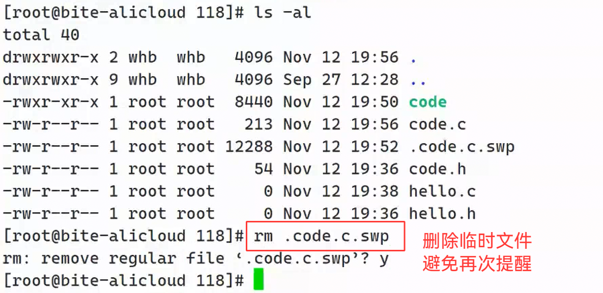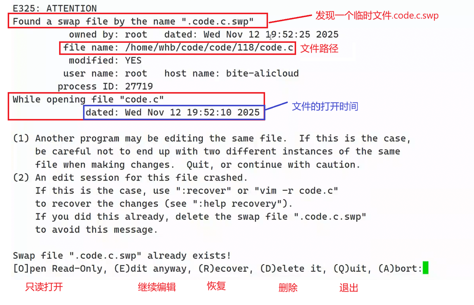 如果我们再次使用vim时,他还会提醒我们以上的界面,那么我们该如何关闭呢?,此时我们只需要删除刚刚那个临时文件即可