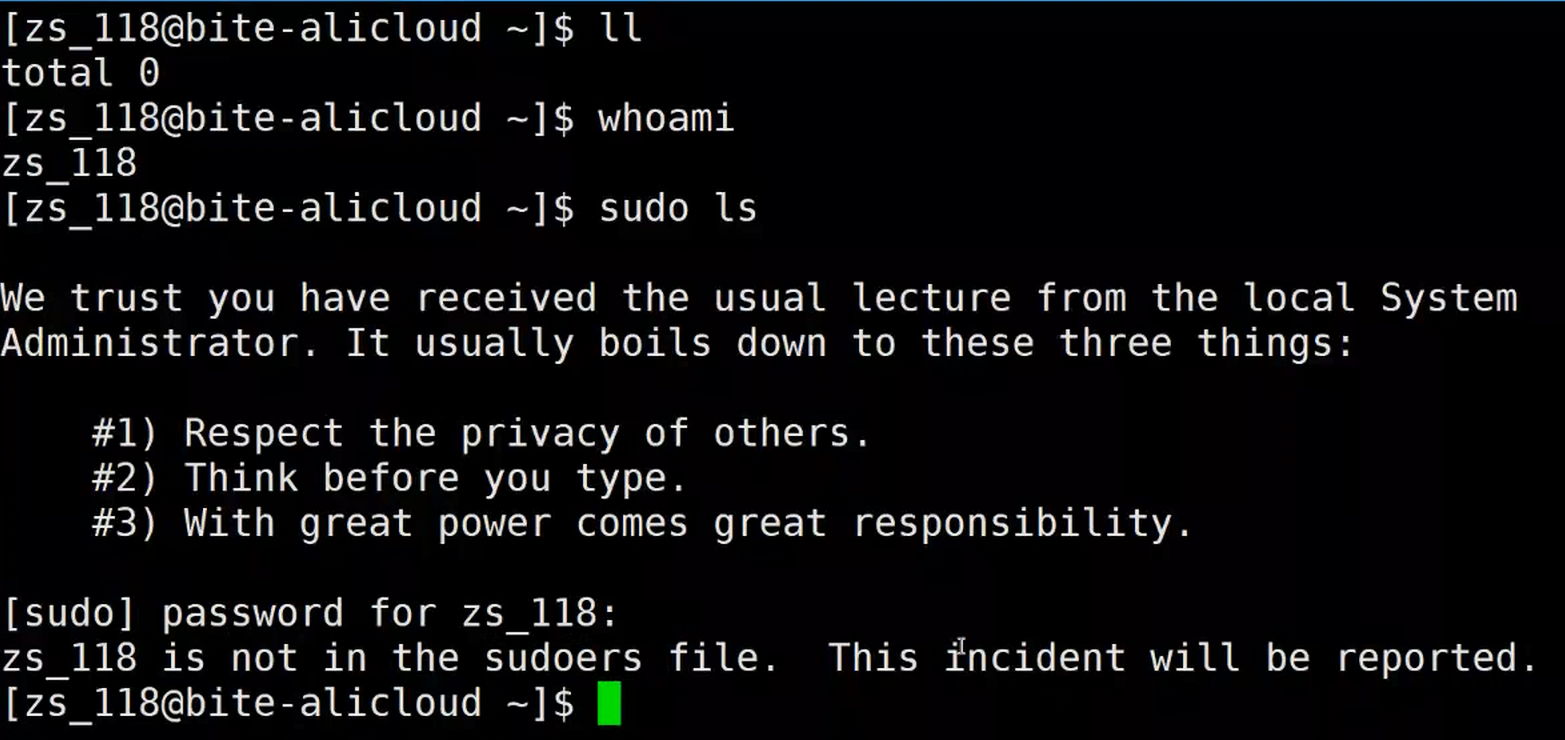 当我们是普通用户时,是无法进行sudo的,因为普通用户没有添加到“白名单”里
