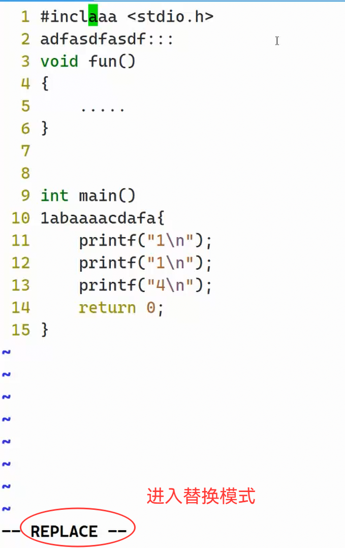 进入方式:在 “命令模式” 下按 R(大写 R,持续替换)或 r(小写 r,单次替换);