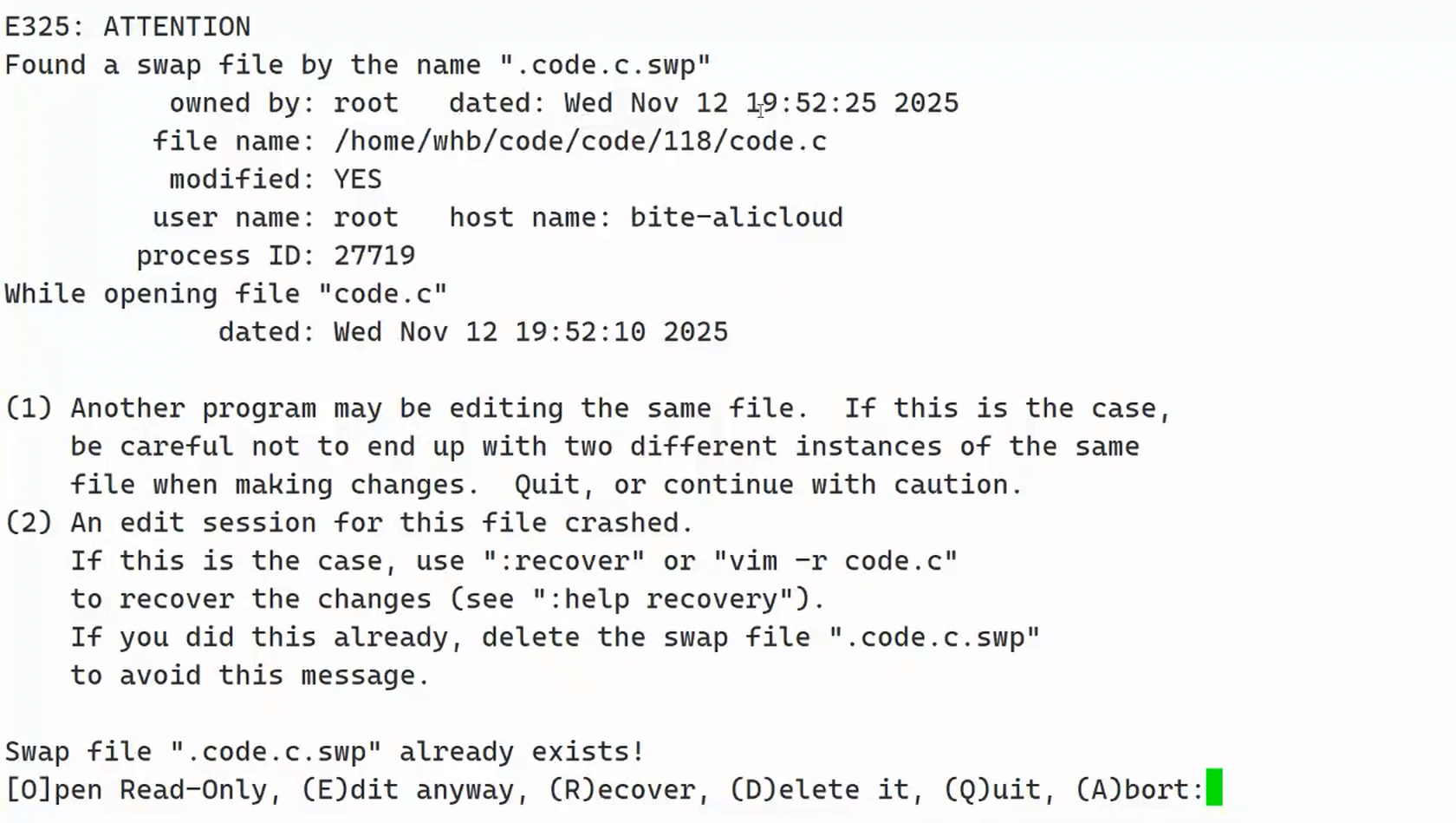 由于存在网络断开等原因,我们在写代码时避免不了异常退出,此时你可能会说:完蛋啦!代码还没有保存😭,此时我们不需要担心!!!当我们再次打开vim时就会出现如下场景: