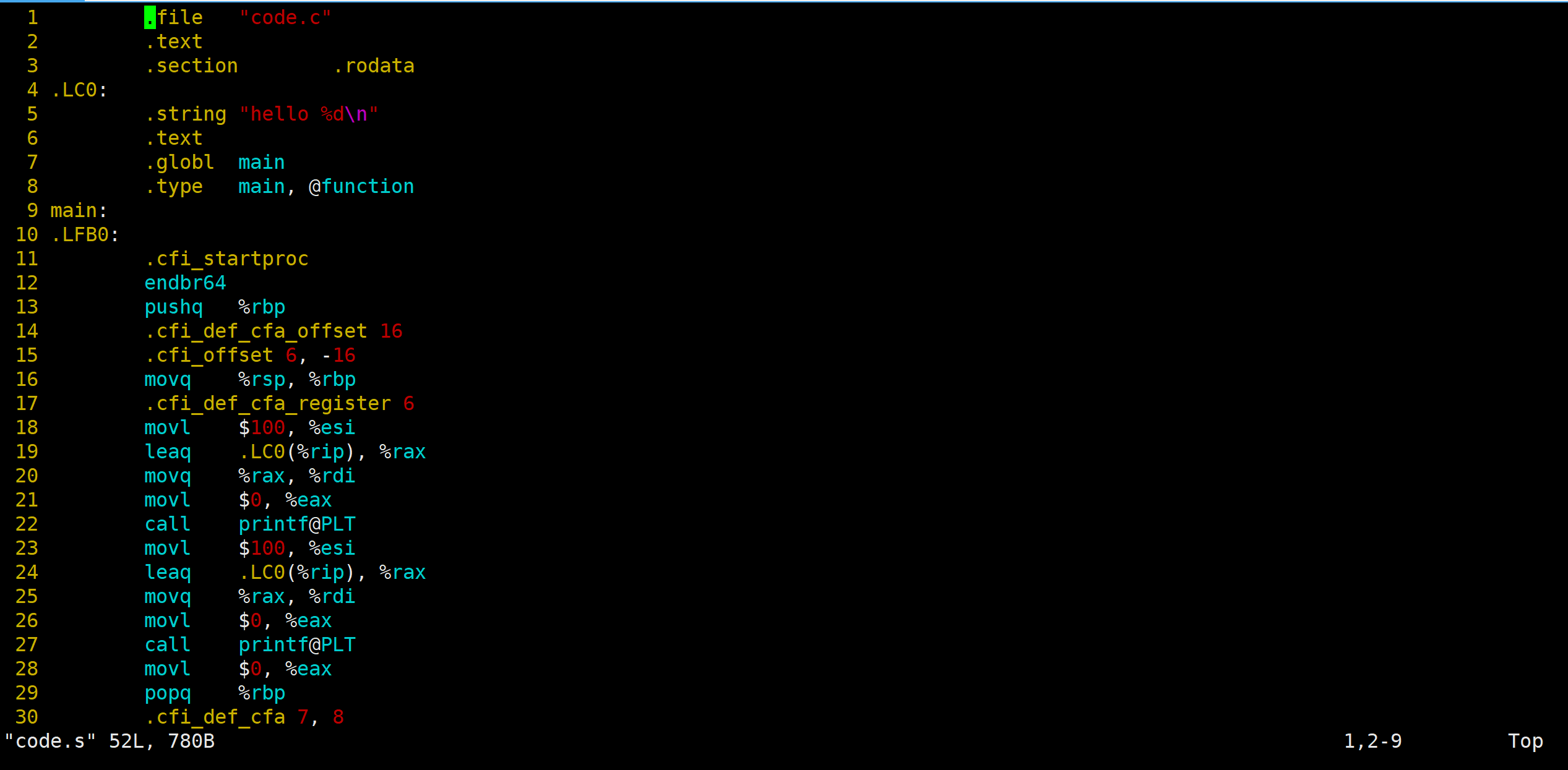 set nu,然后我们打开code.c文件,此时我们就发现code.c文件也带上了行号,