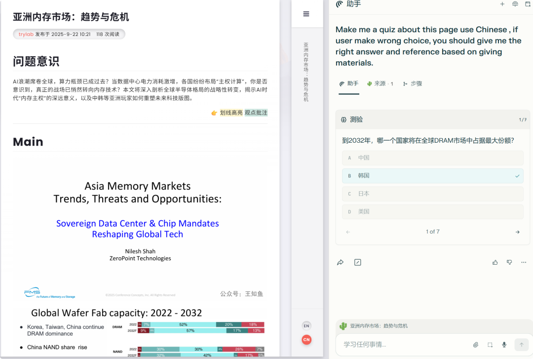 每当遇到一篇好文章,不忍卒读之余还想提炼一些关键信息让自己有所收获,这时候就可以在调出侧边AI助手,不论是全文要点总结、还是出一组测试题,或者闪记卡,通过交互的方式,让读者记住更多关键信息。
