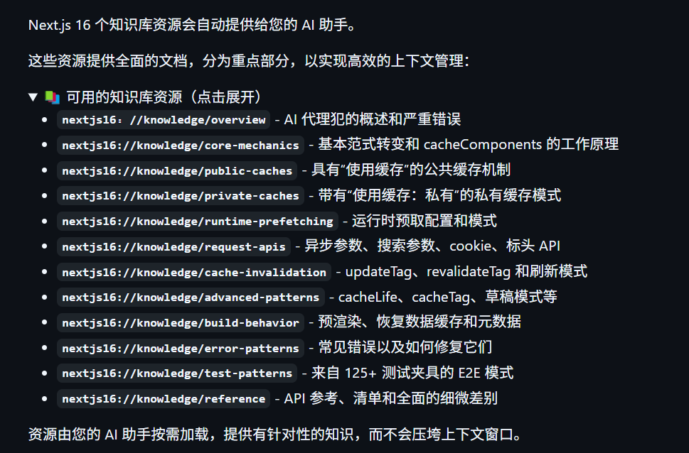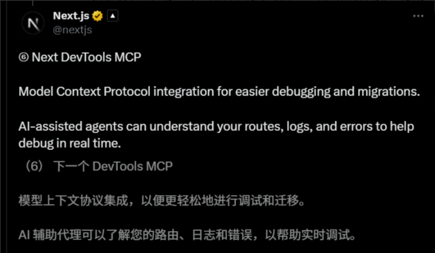 Next.js官方发布了自己的MCP,包含自动化调试、项目结构感知、知识库检索在内的诸多功能。