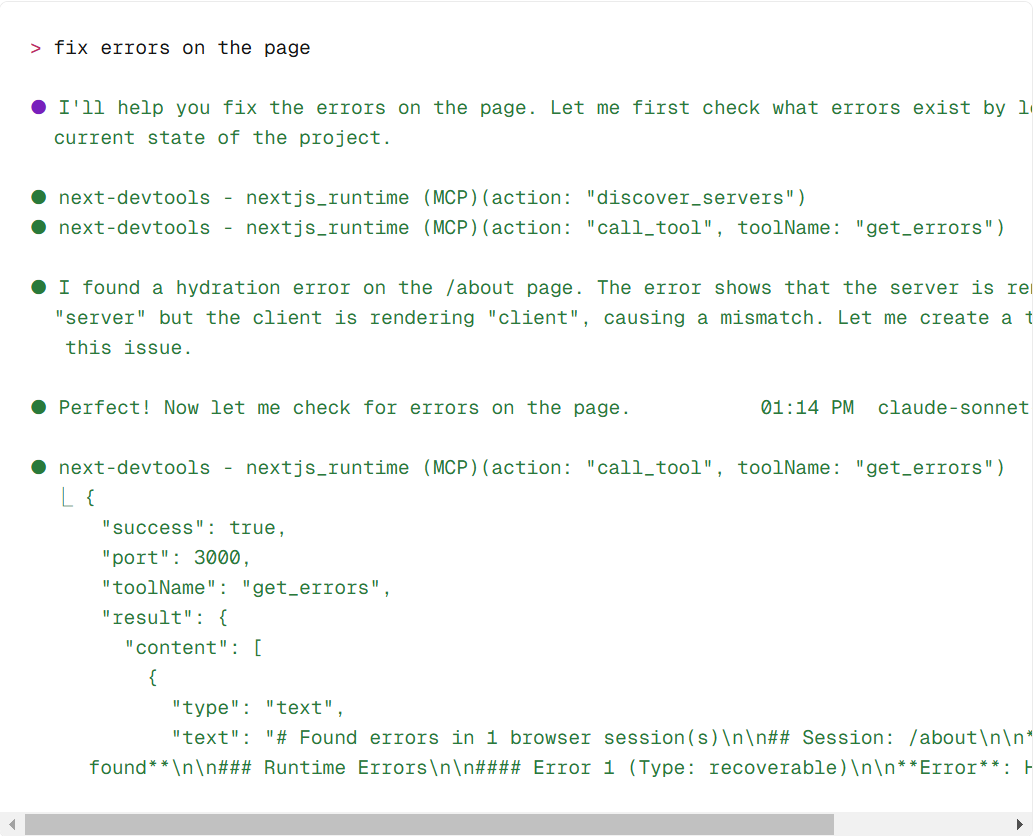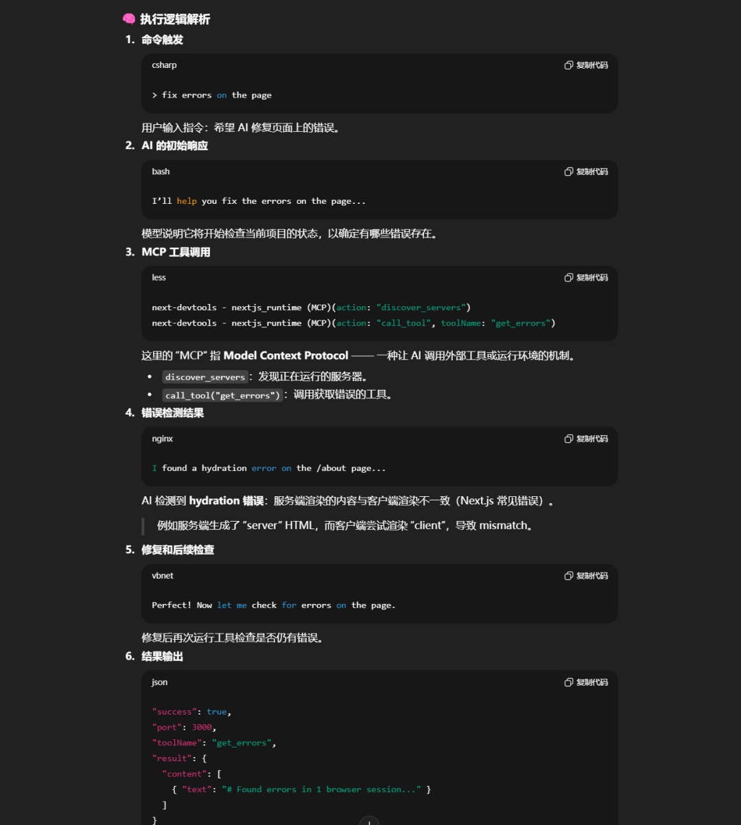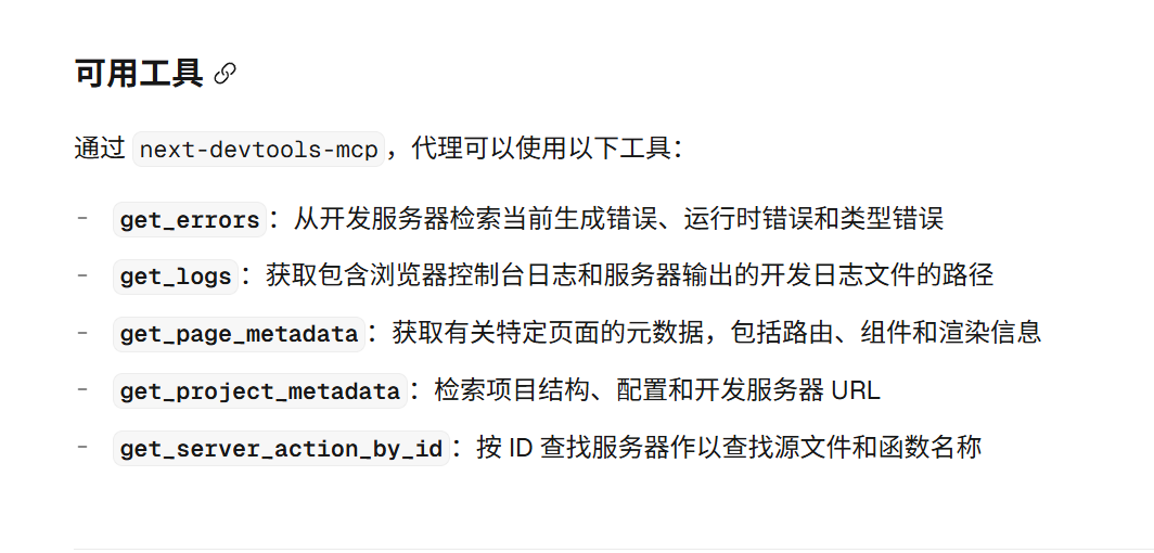 主要是分为解决当前的错误。这些工具可以让代理(AI 助手)直接从正在运行的 Next.js 应用中获取错误、日志和页面信息,从而实现自动诊断与修复。